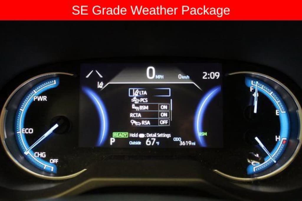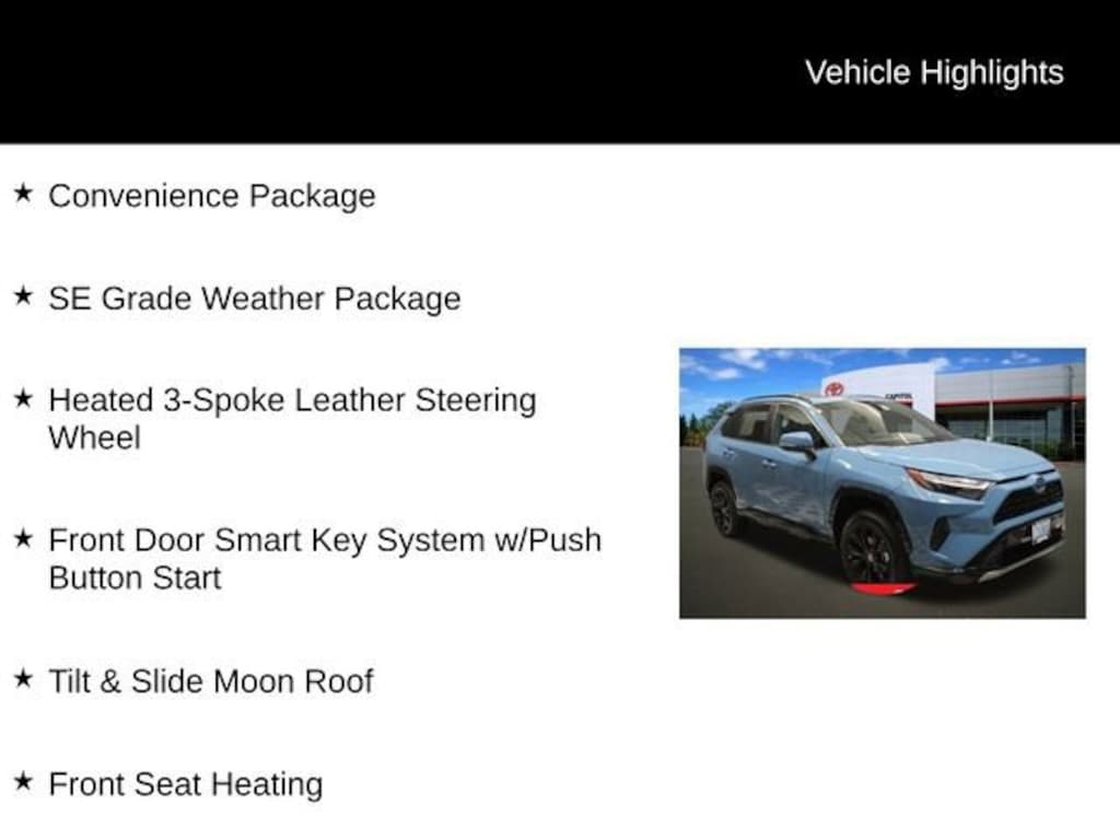 Recent Arrival! We Buy cars- Fast, Fair and Easy This 2023 Cavalry Blue Toyota RAV4 Hybrid SE AWD is well equipped and includes these features and benefits: Convenience Package (Front Door Smart Key System w/Push Button Start and Tilt & Slide Moon Roof), SE Grade Weather Package (Front Seat Heating and Heated 3-Spoke Leather Steering Wheel), 4-Wheel Disc Brakes, 6 Speakers, ABS brakes, Air Conditioning, Alloy wheels, AM/FM radio: SiriusXM, Auto High-beam Headlights, Automatic temperature control, Axle Ratio: TBD, Brake assist, Bumpers: body-color, Delay-off headlights, Driver door bin, Driver vanity mirror, Dual front impact airbags, Dual front side impact airbags, Electronic Stability Control, Emergency communication system: Safety Connect (1-year trial), Exterior Parking Camera Rear, Fabric Seat Trim, Four wheel independent suspension, Front anti-roll bar, Front Bucket Seats, Front Center Armrest, Front dual zone A/C, Front reading lights, Front Sport Seats, Fully automatic headlights, Heated door mirrors, Illuminated entry, Knee airbag, Lane Departure Warning System, Leather Shift Knob, Low tire pressure warning, Occupant sensing airbag, Outside temperature display, Overhead airbag, Overhead console, Panic alarm, Passenger door bin, Passenger vanity mirror, Power door mirrors, Power driver seat, Power Liftgate, Power steering, Power windows, Radio data system, Radio: AM/FM/XM Audio System, Rear anti-roll bar, Rear seat center armrest, Rear window defroster, Rear window wiper, Remote keyless entry, Speed control, Speed-sensing steering, Split folding rear seat, Spoiler, Steering wheel mounted audio controls, Telescoping steering wheel, Tilt steering wheel, Traction control, Trip computer, Turn signal indicator mirrors, Variably intermittent wipers, and Wheels: 18 x 7.0J Silver Aluminum Alloy.