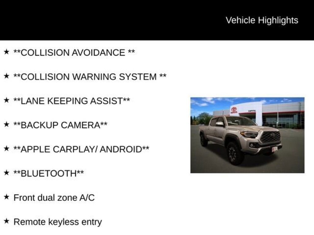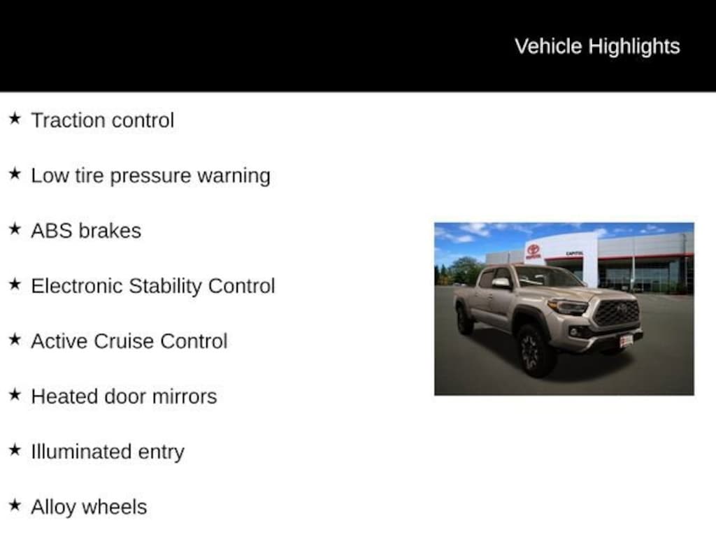We Buy cars- Fast, Fair and Easy This 2023 Celestial Silver Metallic Toyota Tacoma TRD Offroad 4WD is well equipped and includes these features and benefits: ABS brakes, Active Cruise Control, Alloy wheels, Electronic Stability Control, Front dual zone A/C, Heated door mirrors, Illuminated entry, Low tire pressure warning, Remote keyless entry, Traction control, 120V/400W Deck Mounted AC Power, 6 Speakers, Air Conditioning, AM/FM radio: SiriusXM, Anti-whiplash front head restraints, Apple CarPlay/Android Auto, Auto High-beam Headlights, Auto-dimming Rear-View mirror, Automatic temperature control, Axle Ratio: 3.91, Black Overfenders, Brake assist, Bumpers: body-color, Driver door bin, Dual front impact airbags, Dual front side impact airbags, Emergency communication system: Safety Connect (1-year trial), Engine Immobilizer, Exterior Parking Camera Rear, Fabric Seat Trim, Front anti-roll bar, Front Bucket Seats, Front Center Armrest, Front fog lights, Front reading lights, Front Seats, Front wheel independent suspension, Knee airbag, Leather Shift Knob, Occupant sensing airbag, Outside temperature display, Overhead airbag, Overhead console, Panic alarm, Passenger door bin, Power door mirrors, Power driver seat, Power steering, Power windows, Radio: Audio, Rear step bumper, Security system, Speed control, Speed-sensing steering, Split folding rear seat, Steering wheel mounted audio controls, Tachometer, Telescoping steering wheel, Tilt steering wheel, Trip computer, Turn signal indicator mirrors, Variably intermittent wipers, and Wheels: 16 Machined Contrast Alloy.