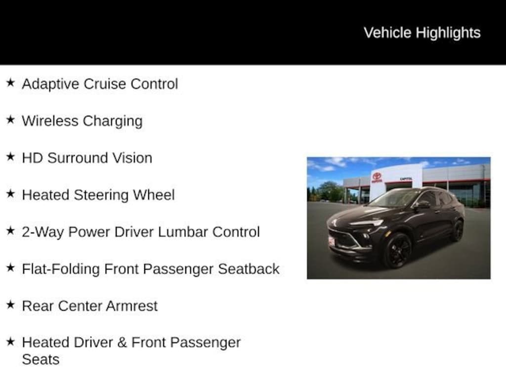 Recent Arrival! We Buy cars- Fast, Fair and Easy This 2025 Ebony Twilight Metallic Buick Encore GX Sport Touring AWD is well equipped and includes these features and benefits: Advanced Technology Package (Adaptive Cruise Control, HD Surround Vision, Rear Park Assist, and Wireless Charging), Comfort Package (2-Way Power Driver Lumbar Control, 8-Way Power Driver Seat Adjuster, Flat-Folding Front Passenger Seatback, Heated Driver & Front Passenger Seats, Heated Steering Wheel, and Rear Center Armrest), Preferred Equipment Group 1SD, 2 USB Ports (1 Type-A, 1 Type-C), 3.17 Final Drive Axle Ratio, 4-Way Manual Passenger Seat Adjuster, 4-Wheel Disc Brakes, 6-Way Manual Driver Seat Adjuster, 7 Speakers, ABS brakes, Air Conditioning, Alloy wheels, AM/FM radio: SiriusXM, Auto High-beam Headlights, Automatic temperature control, Brake assist, Bumpers: body-color, Compass, Delay-off headlights, Driver door bin, Driver vanity mirror, Dual front impact airbags, Dual front side impact airbags, Electronic Stability Control, Emergency communication system: OnStar and Buick connected services capable, Enhanced Performance 7-Speaker System w/Amplifier, Front anti-roll bar, Front Bucket Seats, Front Center Armrest, Front License Plate Bracket, Front reading lights, Front wheel independent suspension, Fully automatic headlights, Heated door mirrors, Illuminated entry, Knee airbag, Leatherette Seat Trim, Low tire pressure warning, Occupant sensing airbag, Outside temperature display, Overhead airbag, Overhead console, Panic alarm, Passenger door bin, Passenger vanity mirror, Power door mirrors, Power Liftgate, Power steering, Power windows, Radio data system, Radio: Audio System w/AM/FM, Rear reading lights, Rear side impact airbag, Rear window defroster, Rear window wiper, Remote keyless entry, Ride & Handling Suspension, Security system, SiriusXM Trial Subscription, Speed control, Speed-sensing steering, Split folding rear seat, Spoiler, Sport steering wheel, Steering wheel mounted audio controls, Tachometer, Telescoping steering wheel, Tilt steering wheel, Traction control, Trip computer, Variably intermittent wipers, Wheels: 18 Gloss Black Aluminum, and Wireless Apple CarPlay/Wireless Android Auto.