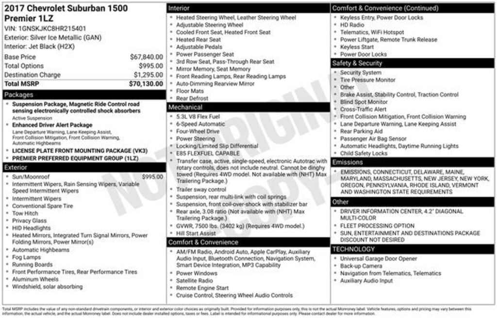 Recent Arrival! Clean CARFAX. Auto High-beam Headlights, Exterior Parking Camera Rear, Heated front seats, Heated rear seats, Lane Keep Assist, Rain sensing wipers, Remote Vehicle Start.Awards:* 2017 KBB.com Best Resale Value Awards * 2017 KBB.com 10 Most Awarded BrandsWe Buy cars- Fast, Fair and Easy This 2017 Silver Ice Metallic Chevrolet Suburban Premier 4WD is well equipped and includes these features and benefits: Enhanced Driver Alert Package (Lane Keep Assist, Forward Collision Alert Sensor Indicator, Intellibeam Headlamps w/Automatic High Beam On/Off, Low Speed Forward Automatic Braking, and Safety Alert Driver Seat), License Plate Front Mounting Package, Magnetic Ride Control Suspension Package, Preferred Equipment Group 1LZ (Remote Vehicle Start, 1st & 2nd Row Color-Keyed Carpeted Floor Mats, 3rd Row 60/40 Power Fold Split-Bench, 4-Wheel Antilock Disc Brakes, Auto-Dimming Inside Rear-View Mirror, Black Assist Steps, Color-Keyed Carpeting Floor Covering, Driver Inboard & Front Passenger Airbags, Electronic Cruise Control w/Set & Resume Speed, Enhanced Driver Information Center, Extended-Range Remote Keyless Entry, Floor Console w/Storage Area, Fog Lamps, Front & Rear Parking Assist, Hands Free Power Liftgate, Heated 2nd Row Outboard Seats, Heated Leather Wrapped Steering Wheel, Memory Settings, OnStar Basic Plan For 5 Years, Passive Entry System, Power Folding & Adjustable Heated Outside Mirrors, Power Release 2nd Row Bucket Seats, Power Tilt & Telescoping Steering Column, Power-Adjustable Accelerator & Brake Pedals, Push Button Keyless Start, Rear Cross-Traffic Alert Sensor Indicator, Roof-Mounted Luggage Rack Side Rails, Side Blind Zone Alert w/Lane Change Alert, SiriusXM Satellite Radio, Universal Home Remote, and Wireless Charging), Auto High-beam Headlights, Exterior Parking Camera Rear, Heated front seats, Heated rear seats, Rain sensing wipers, 10 Speakers, 3.08 Rear Axle Ratio, 3rd row seats: split-bench, 4-Wheel Disc Brakes, 6-Way Power Front Passenger Seat Adjuster, ABS brakes, Adaptive suspension, Adjustable pedals, Air Conditioning, Alloy wheels, AM/FM radio: SiriusXM, Apple CarPlay, Auto-dimming door mirrors, Auto-dimming Rear-View mirror, Automatic temperature control, Bodyside moldings, Bose Centerpoint Premium 10-Speaker Surround Sound, Brake assist, Bumpers: body-color, CD player, Compass, Delay-off headlights, Driver door bin, Driver vanity mirror, Dual front impact airbags, Dual front side impact airbags, Electronic Stability Control, Emergency communication system: OnStar Guidance, Enhanced Driver Information Center (DISC), Front anti-roll bar, Front Bucket Seats, Front Center Armrest, Front dual zone A/C, Front fog lights, Front reading lights, Front wheel independent suspension, Fully automatic headlights, Garage door transmitter, HD Radio, Head-Up Display, Headphones, Heated & Vented Driver & Front Passenger Seats, Heated & Vented Front Reclining Bucket Seats, Heated door mirrors, Heated steering wheel, High-Intensity Discharge Headlights, Illuminated entry, Leather Shift Knob, Low tire pressure warning, Memory seat, Navigation System, NavTraffic, Occupant sensing airbag, Outside temperature display, Overhead airbag, Overhead console, Panic alarm, Passenger door bin, Passenger vanity mirror, Pedal memory, Perforated Leather-Appointed Seat Trim, Power door mirrors, Power driver seat, Power Liftgate, Power passenger seat, Power steering, Power Tilt-Sliding Sunroof w/Express-Open/Close, Power windows, Radio: Chevrolet MyLink AM/FM Stereo w/Navigation, Rear air conditioning, Rear anti-roll bar, Rear audio controls, Rear reading lights, Rear window defroster, Rear window wiper, Remote keyless entry, Roof rack: rails only, Security system, Single-Slot CD/MP3 Player, Speed control, Speed-sensing steering, Split folding rear seat, Spoiler, Steering wheel memory, Steering wheel mounted audio controls, Tachometer, Telescoping steering wheel, Tilt steering wheel, Traction co
