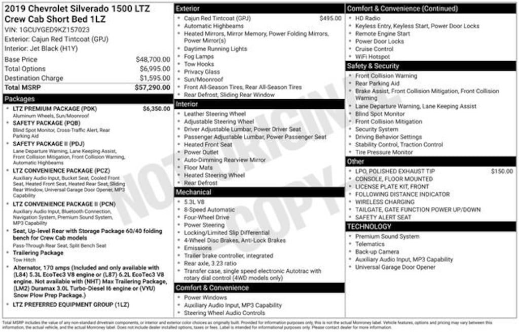 No Payments for 120 days on any New 2025 vehicle only at Capitol Auto Group- with finance terms up to 84 months!! Or any 2023 model or older pre-owned vehicle only at Capitol Auto Group- with finance terms up to 84 months!! Must be a MAPS credit union member to qualify. With an Experian score of 696 or higher. Effective 12-4-2025 through 1-15-2026 See dealer for more qualifying details. Recent Arrival! CARFAX One-Owner. Clean CARFAX. Odometer is 33941 miles below market average!We Buy cars- Fast, Fair and Easy This 2019 Cajun Red Tintcoat Chevrolet Silverado 1500 LTZ 4WD is well equipped and includes these features and benefits: LTZ Convenience Package (2 USB Ports (First Row), 2nd Row Heated Outboard Seats, Floor Mounted Console, Front Bucket Seats, Power Sliding Rear Window w/Rear Defogger, Power Tailgate, Universal Home Remote, and Ventilated Driver & Front Passenger Seats), LTZ Convenience Package II (Premium Bose 7-Speaker Sound System, Radio: Chevrolet Infotainment 3 Premium System, and Wireless Charging), LTZ Premium Package (Power Sunroof), Preferred Equipment Group 1LZ (10-Way Power Driver Seat w/Lumbar, 10-Way Power Passenger Seat Adjuster w/Lumbar, 12-Volt Rear Auxiliary Power Outlet, 120-Volt Bed Mounted Power Outlet, 120-Volt Instrument Panel Power Outlet, 170 Amp Alternator, 4.2 Diagonal Color Display Driver Info Center, 6-Speaker Audio System, Advanced Trailering System, Auto-Dimming Inside Rear-View Mirror, Auxiliary External Transmission Oil Cooler, Bluetooth® For Phone, Chevrolet Connected Access, Chevrolet w/4G LTE, Chrome Grille, Chrome Mirror Caps, Color-Keyed Carpeting Floor Covering, Compass, Deep-Tinted Glass, Driver Memory, Electric Rear-Window Defogger, Electrical Lock Control Steering Column, Electronic Cruise Control, EZ Lift Power Lock & Release Tailgate, Front Frame-Mounted Black Recovery Hooks, Front LED Fog Lamps, Front Rubberized Vinyl Floor Mats, HD Radio, HD Rear Vision Camera, Heated Driver & Front Passenger Seats, Heated Steering Wheel, Heavy-Duty Rear Locking Differential, Hitch Guidance, Hitch Guidance w/Hitch View, Integrated Trailer Brake Controller, Keyless Open & Start, Leather Wrapped Steering Wheel, LED Cargo Area Lighting, Manual Tilt/Telescoping Steering Column, OnStar & Chevrolet Connected Services Capable, Outside Heated Power-Adjustable Mirrors, Power Door Locks, Power Front Passenger Windows w/Express Up/Down, Power Front Windows w/Driver Express Up/Down, Power Rear Windows w/Express Down, Rear Dual USB Charging-Only Ports, Rear Rubberized-Vinyl Floor Mats, Rear Wheelhouse Liners, Remote Vehicle Starter System, SiriusXM Radio, Steering Wheel Audio Controls, Theft Deterrent System (Unauthorized Entry), and Trailer Tire Pressure Monitor System), Safety Package (Lane Change Alert w/Side Blind Zone Alert, Perimeter Lighting, Rear Cross Traffic Alert, and Ultrasonic Front & Rear Park Assist), Safety Package II (Following Distance Indicator, Forward Collision Alert, Front Pedestrian Braking, IntelliBeam Automatic High Beam On/Off, Lane Keep Assist w/Lane Departure Warning, Low Speed Forward Automatic Braking, and Safety Alert Seat), Trailering Package, Up-Level Rear Seat w/Storage Package, 3.23 Rear Axle Ratio, 4-Wheel Disc Brakes, 40/20/40 Front Split-Bench Seat, 6 Speakers, ABS brakes, Air Conditioning, Alloy wheels, AM/FM radio: SiriusXM, Apple CarPlay/Android Auto, Auto-dimming door mirrors, Auto-dimming Rear-View mirror, Automatic temperature control, Brake assist, Bumpers: chrome, Delay-off headlights, Driver door bin, Driver vanity mirror, Dual front impact airbags, Dual front side impact airbags, Electronic Stability Control, Front anti-roll bar, Front Center Armrest w/Storage, Front dual zone A/C, Front fog lights, Front License Plate Kit, Front reading lights, Front wheel independent suspension, Fully automatic headlights, Heated door mirrors, Heated front seats, Heated steering wheel, Heavy Duty Suspension, Illuminated entry, Low tire pressure warning, Memor