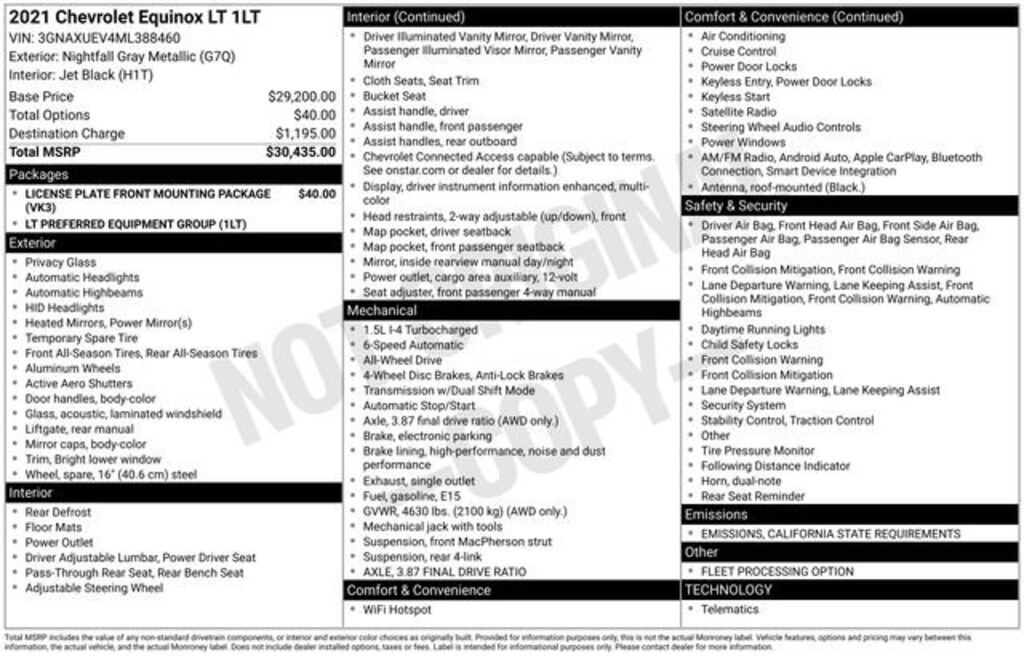 We Buy cars- Fast, Fair and Easy This 2021 Nightfall Gray Metallic Chevrolet Equinox LT AWD is well equipped and includes these features and benefits: Preferred Equipment Group 1LT, 17 Aluminum Wheels, 2 Rear USB Charging-Only Ports, 2 USB Ports & Auxiliary Input Jack, 2-Way Power Driver Lumbar Control Seat Adjuster, 3.87 Final Drive Axle Ratio, 4-Wheel Disc Brakes, 6 Speaker Audio System Feature, 6 Speakers, 8-Way Power Driver Seat Adjuster, ABS brakes, Air Conditioning, Alloy wheels, AM/FM radio: SiriusXM, Apple CarPlay/Android Auto, Auto High-beam Headlights, Bluetooth® For Phone, Brake assist, Bumpers: body-color, Compass, Delay-off headlights, Driver door bin, Driver vanity mirror, Dual front impact airbags, Dual front side impact airbags, Electronic Stability Control, Emergency communication system: OnStar and Chevrolet connected services capable, Four wheel independent suspension, Front anti-roll bar, Front Bucket Seats, Front Center Armrest, Front Passenger 4-Way Manual Seat Adjuster, Front reading lights, Fully automatic headlights, Heated door mirrors, High-Intensity Discharge Headlights, Illuminated entry, Low tire pressure warning, Occupant sensing airbag, Outside temperature display, Overhead airbag, Overhead console, Panic alarm, Passenger door bin, Passenger vanity mirror, Power door mirrors, Power driver seat, Power steering, Power windows, Premium audio system: Chevrolet Infotainment 3, Premium Cloth Seat Trim, Radio data system, Radio: Chevrolet Infotainment 3 System w/AM/FM, Rear anti-roll bar, Rear reading lights, Rear seat center armrest, Rear window defroster, Rear window wiper, Remote keyless entry, Security system, SiriusXM Radio, Speed control, Speed-sensing steering, Split folding rear seat, Spoiler, Steering wheel mounted audio controls, Tachometer, Telescoping steering wheel, Tilt steering wheel, Traction control, Trip computer, and Variably intermittent wipers.