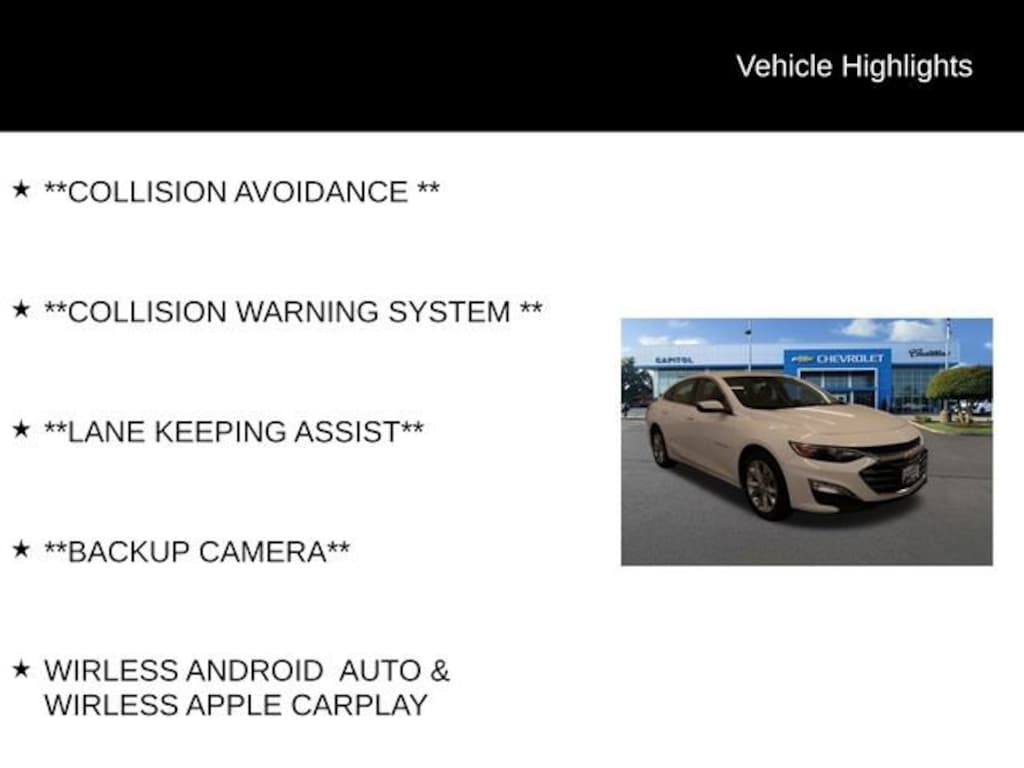 CARFAX One-Owner. **COLLISION AVOIDANCE **, **COLLISION WARNING SYSTEM **, **LANE KEEPING ASSIST**, **BACKUP CAMERA**, WIRLESS ANDROID AUTO & WIRLESS APPLE CARPLAY, Heated Driver & Front Passenger Seats. Priced below KBB Fair Purchase Price! 27/35 City/Highway MPGWe Buy cars- Fast, Fair and Easy This 2023 Summit White Chevrolet Malibu LT FWD is well equipped and includes these features and benefits: Preferred Equipment Group 1LT, Heated Driver & Front Passenger Seats, 17 Aluminum Wheels, 4-Wheel Disc Brakes, 6 Speakers, 6-Speaker Audio System Feature, 6-Way Manual Front Passenger Seat Adjuster, 8-Way Power Driver Seat Adjuster, ABS brakes, Air Conditioning, Alloy wheels, AM/FM radio: SiriusXM, Apple CarPlay/Android Auto, Auto High-beam Headlights, Automatic temperature control, Brake assist, Bumpers: body-color, Compass, Delay-off headlights, Deleted 3 Years of Remote Access, Driver door bin, Driver vanity mirror, Dual front impact airbags, Dual front side impact airbags, Electronic Stability Control, Emergency communication system: OnStar and Chevrolet connected services capable, Exterior Parking Camera Rear, Four wheel independent suspension, Front anti-roll bar, Front Bucket Seats, Front Center Armrest, Front dual zone A/C, Front License Plate Bracket, Front reading lights, Fully automatic headlights, Heated door mirrors, Heated front seats, Illuminated entry, Knee airbag, Low tire pressure warning, Occupant sensing airbag, Outside temperature display, Overhead airbag, Overhead console, Panic alarm, Passenger door bin, Passenger vanity mirror, Power door mirrors, Power Driver Lumbar Control Seat Adjuster, Power driver seat, Power steering, Power windows, Premium audio system: Chevrolet Infotainment 3 Plus, Premium Cloth Seat Trim, Radio data system, Radio: Chevrolet Infotainment 3 System, Rear anti-roll bar, Rear reading lights, Rear seat center armrest, Rear side impact airbag, Rear window defroster, Remote keyless entry, Security system, SiriusXM Radio, Speed control, Split folding rear seat, Steering wheel mounted audio controls, Tachometer, Telescoping steering wheel, Tilt steering wheel, Traction control, Trip computer, Variably intermittent wipers, Voltmeter, and Wireless Apple CarPlay/Android Auto.