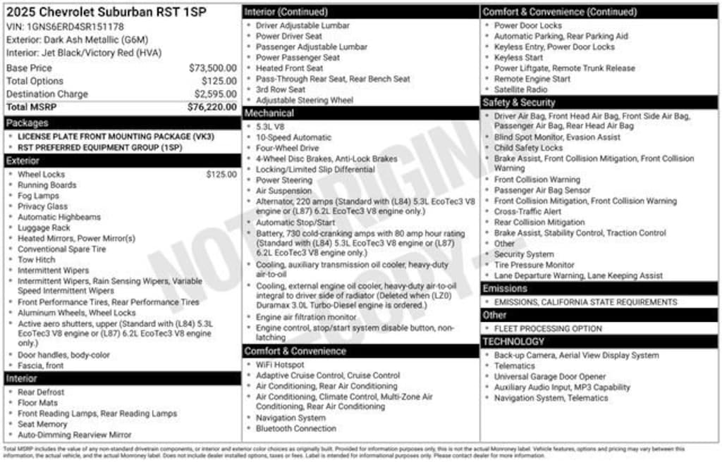 We Buy cars- Fast, Fair and Easy This 2025 Dark Ash Metallic Chevrolet Suburban RST 4WD is well equipped and includes these features and benefits: License Plate Front Mounting Package, Preferred Equipment Group 1SP (8-Way Power Front Passenger Seat Adjuster, Auto-Dimming Inside Rear-View Mirror, Dual Exhaust System, Front LED Fog Lamps, Memory Settings For Driver, Rear Power Liftgate, RST Exterior Features, Universal Home Remote, Wheels: 22 x 9 Bright Machined, and Wireless Phone Charging), 2-Way Driver Power Lumbar Seat Adjuster, 2-Way Front Passenger Power Lumbar Seat Adjuster, 3.23 Rear Axle Ratio, 3rd row seats: split-bench, 4-Wheel Disc Brakes, 6 Speakers, 6-Speaker Audio System, 8-Way Power Driver Seat Adjuster, ABS brakes, Air Conditioning, Alloy wheels, AM/FM radio: SiriusXM with 360L, Apple CarPlay/Android Auto, Auto High-beam Headlights, Auto-dimming Rear-View mirror, Automatic temperature control, Brake assist, Bumpers: body-color, Compass, Delay-off headlights, Driver door bin, Driver vanity mirror, Dual front impact airbags, Dual front side impact airbags, Electronic Stability Control, Emergency communication system: OnStar Services capable, Exterior Parking Camera Rear, Four wheel independent suspension, Front anti-roll bar, Front Bucket Seats, Front Center Armrest, Front dual zone A/C, Front fog lights, Front reading lights, Fully automatic headlights, Garage door transmitter, Heated door mirrors, Heated front seats, Illuminated entry, Low tire pressure warning, Memory seat, Navigation system: Google built-in compatibility (select service plan required, terms and limitations apply), Occupant sensing airbag, Outside temperature display, Overhead airbag, Overhead console, Panic alarm, Passenger door bin, Passenger vanity mirror, Perforated Leather Seating Surfaces, Power door mirrors, Power driver seat, Power Liftgate, Power passenger seat, Power steering, Power windows, Premium Smooth Ride Suspension, Radio data system, Radio: 17.7 Diagonal Advanced Color LCD Display, Rain sensing wipers, Rear air conditioning, Rear anti-roll bar, Rear reading lights, Rear seat center armrest, Rear window defroster, Rear window wiper, Remote keyless entry, Security system, Speed control, Speed-sensing steering, Split folding rear seat, Spoiler, Steering wheel mounted audio controls, Tachometer, Telescoping steering wheel, Tilt steering wheel, Traction control, Trip computer, Variably intermittent wipers, Voltmeter, and Wireless Apple CarPlay/Wireless Android Auto.