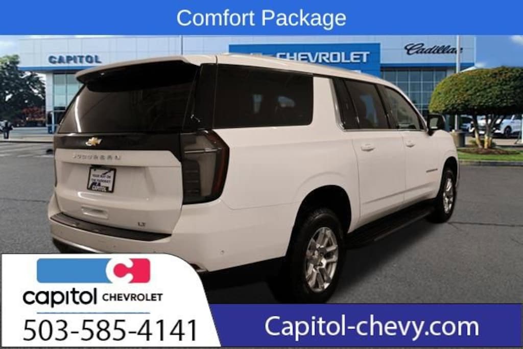 We Buy cars- Fast, Fair and Easy This 2025 Summit White Chevrolet Suburban LT 4WD is well equipped and includes these features and benefits: Comfort Package (2nd Row Power Release 60/40 Split-Folding Bench Seat, 3rd Row 60/40 Power-Folding Split-Bench, Bose 10-Speaker Surround with CenterPoint, Heated 2nd Row Outboard Seats, Heated Power-Adjustable Outside Mirrors, Heated Steering Wheel, LED Headlamps with LED Daytime Running Lamps, LED Tail Lamps, and Memory Settings), Luxury Package (Auto-Dimming Inside Rear-View Mirror, Front LED Fog Lamps, and Universal Home Remote), 2-Way Driver Power Lumbar Seat Adjuster, 2-Way Front Passenger Power Lumbar Seat Adjuster, 3.23 Rear Axle Ratio, 3rd row seats: split-bench, 4-Wheel Disc Brakes, 6 Speakers, 6-Speaker Audio System, 8-Way Power Driver Seat Adjuster, 8-Way Power Front Passenger Seat Adjuster, ABS brakes, Air Conditioning, Alloy wheels, AM/FM radio: SiriusXM with 360L, Apple CarPlay/Android Auto, Auto High-beam Headlights, Automatic temperature control, Brake assist, Bumpers: body-color, Compass, Delay-off headlights, Driver door bin, Driver vanity mirror, Dual front impact airbags, Dual front side impact airbags, Electronic Stability Control, Emergency communication system: OnStar Services capable, Exterior Parking Camera Rear, Four wheel independent suspension, Front anti-roll bar, Front Bucket Seats, Front Center Armrest, Front dual zone A/C, Front reading lights, Fully automatic headlights, Heated door mirrors, Heated Driver and Front Passenger Seats, Heated front seats, Illuminated entry, Leather-Appointed Seating, Low tire pressure warning, Memory seat, Memory Settings For Driver, Navigation system: Google built-in compatibility (select service plan required, terms and limitations apply), Occupant sensing airbag, Outside temperature display, Overhead airbag, Overhead console, Panic alarm, Passenger door bin, Passenger vanity mirror, Power door mirrors, Power driver seat, Power Liftgate, Power passenger seat, Power steering, Power windows, Premium Smooth Ride Suspension, Radio data system, Radio: 17.7 Diagonal Advanced Color LCD Display, Rain sensing wipers, Rear air conditioning, Rear anti-roll bar, Rear Power Liftgate, Rear reading lights, Rear seat center armrest, Rear window defroster, Rear window wiper, Remote keyless entry, Security system, SiriusXM with 360L Trial Subscription, Speed control, Speed-sensing steering, Split folding rear seat, Spoiler, Steering wheel mounted audio controls, Tachometer, Telescoping steering wheel, Tilt steering wheel, Traction control, Trip computer, Variably intermittent wipers, Voltmeter, Wheels: 18 x 8.5 Bright Silver Painted Aluminum, Wireless Apple CarPlay/Wireless Android Auto, and Wireless Phone Charging.