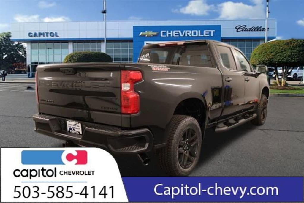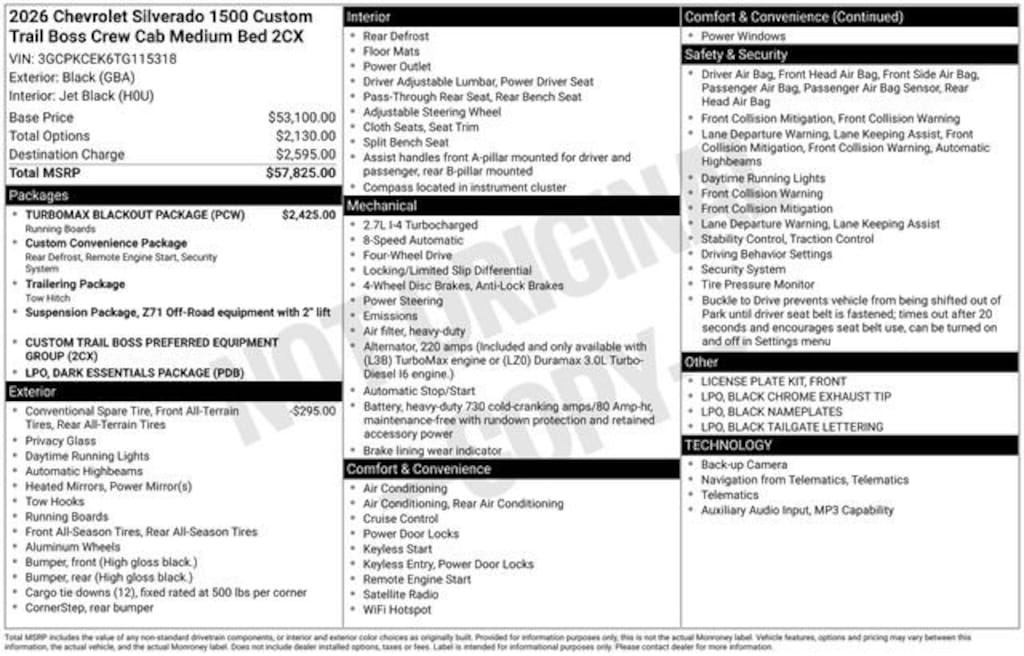 We Buy cars- Fast, Fair and Easy This 2026 Black Chevrolet Silverado 1500 Custom Trail Boss 4WD is well equipped and includes these features and benefits: Custom Convenience Package (Electric Rear-Window Defogger, EZ Lift Power Lock & Release Tailgate, LED Cargo Area Lighting, Remote Vehicle Starter System, and Theft Deterrent System (Unauthorized Entry)), Dark Essentials Package (LPO) (Black Name Plates (LPO)), Preferred Equipment Group 2CX (10-Way Power Driver Seat w/Lumbar, 120-Volt Bed Mounted Power Outlet, 120-Volt Interior Power Outlet, 3.5 Monochromatic Display Driver Info Center, Auto-Locking Rear Differential, Bluetooth® For Phone, Color-Keyed Carpeting Floor Covering, Deep-Tinted Glass, Dual Rear USB Ports (Charge Only), Electronic Cruise Control, Front Rubberized Vinyl Floor Mats, HD Rear Vision Camera, Manual Tilt Wheel Steering Column, OnStar Services Capable, Performance Red Recovery Hooks, Power Front Windows w/Driver Express Up/Down, Power Front Windows w/Passenger Express Down, Power Rear Windows w/Express Down, Rear 60/40 Folding Bench Seat (Folds Up), Rear Rubberized-Vinyl Floor Mats, Remote Keyless Entry, SiriusXM Trial Subscription, Standard Tailgate, Teen Driver, Tire Pressure Monitoring System, and Wi-Fi Hot Spot Capable), Suspension Package (Heavy-Duty Air Filter and Hill Descent Control), Trailering Package (Hitch Guidance), TurboMax Blackout Package (4 Black Round Assist Steps (LPO), Black Chrome Exhaust Tip (LPO), and Wheels: 20 x 9 High Gloss Black Painted Alum), 220 Amp Alternator, 3.42 Rear Axle Ratio, 4-Wheel Disc Brakes, 40/20/40 Front Split-Bench Seat, 6 Speakers, 6-Speaker Audio System, ABS brakes, Air Conditioning, Alloy wheels, AM/FM radio: SiriusXM, Apple CarPlay/Android Auto, Auto High-beam Headlights, Automatic Emergency Braking, Black Tailgate CHEVROLET Lettering (LPO), Brake assist, Cloth Seat Trim, Compass, Delay-off headlights, Driver door bin, Driver vanity mirror, Dual front impact airbags, Dual front side impact airbags, Electronic Stability Control, Emergency communication system: OnStar, Following Distance Indicator, Forward Collision Alert, Front anti-roll bar, Front Center Armrest w/Storage, Front Frame-Mounted Black Recovery Hooks, Front License Plate Kit, Front Pedestrian Braking, Front reading lights, Front wheel independent suspension, Fully automatic headlights, Heated door mirrors, Illuminated entry, IntelliBeam Automatic High Beam On/Off, Lane Keep Assist w/Lane Departure Warning, Low tire pressure warning, Occupant sensing airbag, Outside temperature display, Overhead airbag, Overhead console, Panic alarm, Passenger door bin, Passenger vanity mirror, Power door mirrors, Power driver seat, Power steering, Power windows, Premium audio system: Chevrolet Infotainment 3, Radio data system, Radio: Chevrolet Infotainment 3 System, Rear reading lights, Rear step bumper, Rear window defroster, Remote keyless entry, Security system, Single Outlet Exhaust, Speed control, Speed-sensing steering, Split folding rear seat, Tachometer, Tilt steering wheel, Traction control, Trip computer, Variably intermittent wipers, Voltmeter, and Wheels: 18 x 8.5 Black Painted Aluminum.
