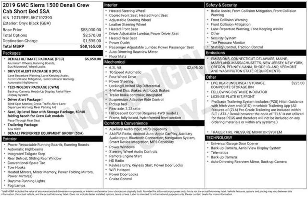 We Buy cars- Fast, Fair and Easy This 2019 Onyx Black GMC Sierra 1500 Denali 4WD is well equipped and includes these features and benefits: Denali Ultimate Package (GMC MultiPro Power Steps, Power Sunroof, and Trailer Tire Pressure Monitor System), Driver Alert Package I (Lane Change Alert w/Side Blind Zone Alert, Rear Cross Traffic Alert, and Ultrasonic Front & Rear Park Assist), Driver Alert Package II (Following Distance Indicator, Forward Collision Alert, Front Pedestrian Braking, IntelliBeam Automatic High Beam On/Off, Lane Keep Assist w/Lane Departure Warning, and Low Speed Forward Automatic Braking), Preferred Equipment Group 5SA (12-Volt Rear Auxiliary Power Outlet, 120-Volt Bed Mounted Power Outlet, 120-Volt Instrument Panel Power Outlet, 170 Amp Alternator, 2 USB Ports, 2 USB Ports (1st Row), Auxiliary External Transmission Oil Cooler, Chrome Assist Steps, Chrome Recovery Hooks, Color-Keyed Carpeting Floor Covering, Compass, Deep-Tinted Glass, Electric Rear-Window Defogger, Electrical Lock Control Steering Column, Floor Mounted Console, GMC 4G LTE, GMC Connected Access, HD Radio, HD Rear Vision Camera, Heated 2nd Row Outboard Seats, Heated Driver & Front Passenger Seating, Heavy-Duty Rear Locking Differential, High-Capacity Air Filter, Hill Descent Control, Hitch Guidance, Hitch Guidance w/Hitch View, In-Vehicle Trailering App, Integrated Trailer Brake Controller, Keyless Open & Start, LED Cargo Area Lighting, Manual Tilt-Wheel & Telescoping Steering Column, OnStar & GMC Connected Services Capable, Power Door Locks, Power Front Passenger Windows w/Express Up/Down, Power Front Windows w/Driver Express Up/Down, Power Rear Windows w/Express Down, Power Sliding Rear Window w/Rear Defogger, Rear Dual USB Charging-Only Ports, Rear Wheelhouse Liners, Remote Vehicle Starter System, Safety Alert Seat, Signature Denali Grille, Spray-On Pickup Bed Liner w/Denali Logo, Steering Wheel Audio Controls, Theft Deterrent System (Unauthorized Entry), Universal Home Remote, Ventilated Driver & Front Passenger Seats, and Wireless Charging), Technology Package (HD Surround Vision, Multi-Color 15 Diagonal Head-Up Display, and Rear Camera Mirror), Trailering Package, 10-Way Power Driver Seat Adjuster w/Lumbar, 10-Way Power Passenger Seat Adjuster w/Lumbar, 3.23 Rear Axle Ratio, 4-Wheel Disc Brakes, 7 Speakers, ABS brakes, Adaptive Ride Control Suspension, Adaptive suspension, Air Conditioning, Alloy wheels, AM/FM radio: SiriusXM, Apple CarPlay/Android Auto, Auto-dimming door mirrors, Auto-dimming Rear-View mirror, Automatic temperature control, Brake assist, Bumpers: body-color, Delay-off headlights, Driver door bin, Driver Memory, Driver vanity mirror, Dual front impact airbags, Dual front side impact airbags, Electronic Stability Control, Forge Perforated Leather-Appointed Seat Trim, Front anti-roll bar, Front Bucket Seats, Front Center Armrest, Front dual zone A/C, Front fog lights, Front License Plate Kit, Front reading lights, Front wheel independent suspension, Fully automatic headlights, Garage door transmitter, Genuine wood console insert, Genuine wood door panel insert, Heated door mirrors, Heated front seats, Heated rear seats, Heated steering wheel, Illuminated entry, Low tire pressure warning, Memory seat, Navigation System, Occupant sensing airbag, Outside temperature display, Overhead airbag, Overhead console, Panic alarm, Passenger door bin, Passenger vanity mirror, Power door mirrors, Power driver seat, Power passenger seat, Power steering, Power windows, Premium audio system: GMC Infotainment System, Premium Bose 7-Speaker Sound System, Radio data system, Radio: Premium GMC Infotainment Sys w/Navigation, Rear reading lights, Rear seat center armrest, Rear step bumper, Rear Underseat Storage (LPO), Rear window defroster, Remote keyless entry, Security system, SiriusXM Radio, Speed control, Speed-sensing steering, Split folding rear seat, Steering wheel mounted audio controls,