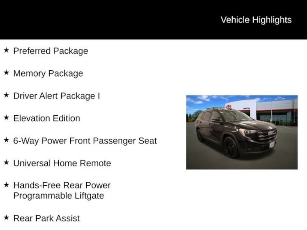 6-Way Power Front Passenger Seat, Adaptive Cruise Control - Camera, Black GMC Center Caps w/Black GMC Lettering, Black Mirror Caps, Darkened Front Grille, Driver Alert Package I, Elevation Edition, Hands-Free Rear Power Programmable Liftgate, Heated Steering Wheel, Lane Change Alert w/Side Blind Zone Alert, Memory Package, Preferred Package, Rear Cross-Traffic Alert, Rear Park Assist, Roof-Mounted Luggage Rack Black Side Rails, Safety Alert Seat, Universal Home Remote, Wheels: 19 x 7.5 Gloss Black Painted Aluminum.
