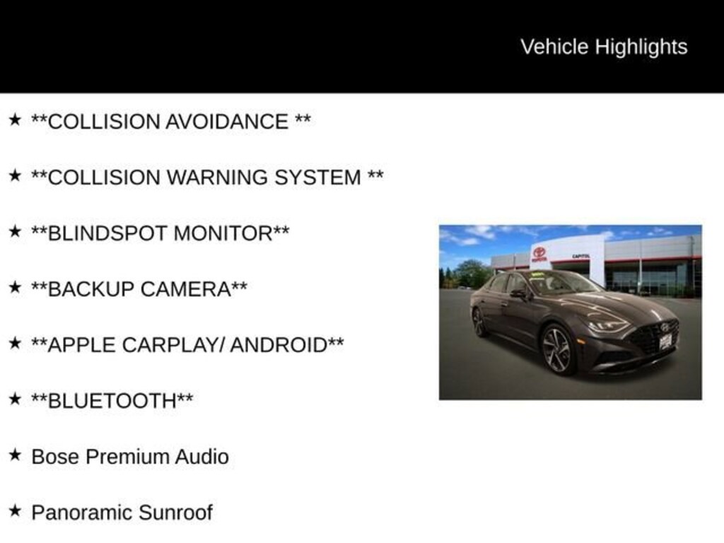 **COLLISION AVOIDANCE **, **COLLISION WARNING SYSTEM **, **BLINDSPOT MONITOR**, **BACKUP CAMERA**, **APPLE CARPLAY/ ANDROID**, **BLUETOOTH**, Black Artificial Leather, Bose Premium Audio, Panoramic Sunroof.