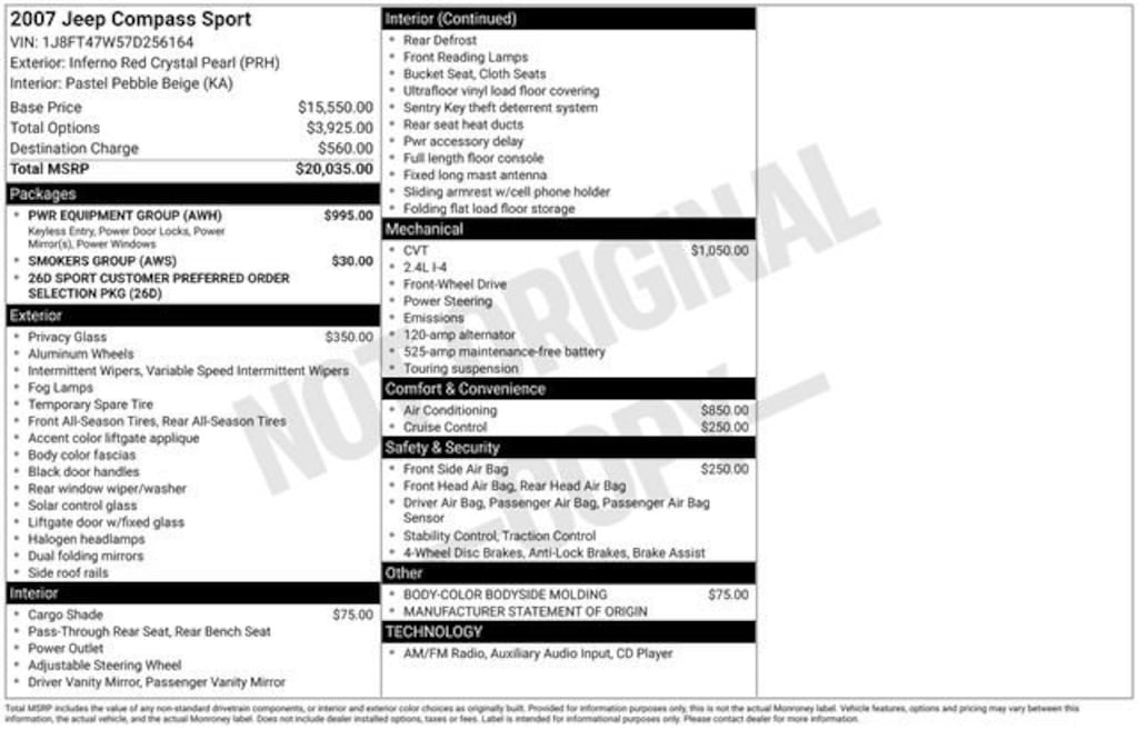 We Buy cars- Fast, Fair and Easy This 2007 Inferno Red Crystal Pearlcoat Jeep Compass Sport FWD is well equipped and includes these features and benefits: Power Equipment Group (Body Color Liftgate Applique, Illuminated Entry, Keyless Entry, Power Driver 1-Touch Windows, Power Fold-Away Mirrors, and Speed Sensitive Power Locks), Quick Order Package 26D, Smoker's Group (Cigar Lighter and Removable Ash Tray), 17 x 6.5 Aluminum Sparkle Silver Wheels, 4 Speakers, 4-Wheel Disc Brakes, 4.12 Axle Ratio, ABS brakes, Air Conditioning, Alloy wheels, AM/FM Compact Disc, AM/FM radio, Brake assist, Bumpers: body-color, CD player, Cloth Low-Back Bucket Seats, Deep Tint Sunscreen Glass, Driver door bin, Driver vanity mirror, Dual front impact airbags, Electronic Stability Control, Four wheel independent suspension, Front anti-roll bar, Front Bucket Seats, Front Center Armrest w/Storage, Front fog lights, Manufacturer's Statement of Origin, Occupant sensing airbag, Outside temperature display, Overhead airbag, Passenger door bin, Passenger vanity mirror, Power steering, Rear window defroster, Rear window wiper, Roof rack: rails only, Soft Tonneau Cover, Split folding rear seat, Spoiler, Tachometer, Tilt steering wheel, and Variably intermittent wipers.