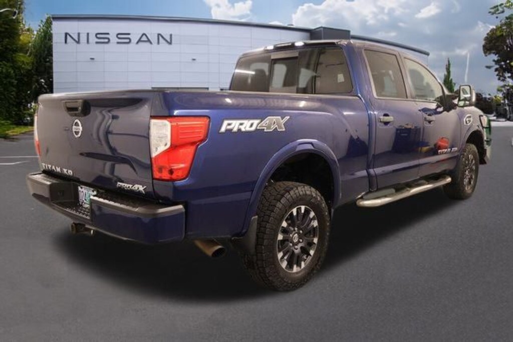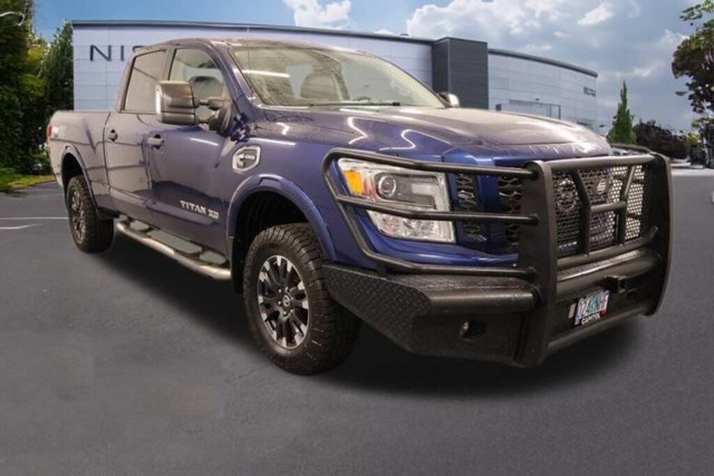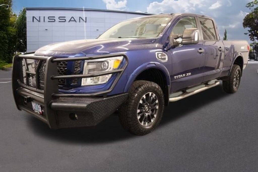 We Buy cars- Fast, Fair and Easy This 2018 Deep Blue Pearl Nissan Titan XD PRO-4X 4WD is well equipped and includes these features and benefits: 3.916 Axle Ratio, 4-Wheel Disc Brakes, 6 Speaker System, 6 Speakers, ABS brakes, Air Conditioning, Alloy wheels, AM/FM radio: SiriusXM, Automatic temperature control, Block heater, Brake assist, CD player, Delay-off headlights, Driver door bin, Driver vanity mirror, Dual front impact airbags, Dual front side impact airbags, Electronic Stability Control, Front anti-roll bar, Front Bucket Seats, Front Captain's Chairs, Front Center Armrest, Front dual zone A/C, Front fog lights, Front reading lights, Front wheel independent suspension, Heated door mirrors, Illuminated entry, Leather steering wheel, LED Fog Lights w/Bright Chrome Bezel, Low tire pressure warning, Navigation System, Outside temperature display, Overhead airbag, Overhead console, Panic alarm, Passenger door bin, Passenger vanity mirror, Power door mirrors, Power driver seat, Power steering, Power windows, Radio data system, Radio: NissanConnect w/Navigation & Mobile Apps, Rain sensing wipers, Rear anti-roll bar, Rear seat center armrest, Rear step bumper, Rear window defroster, Remote keyless entry, Rockford Fosgate Premium Audio w/12 Speakers, Security system, Speed control, Speed-sensing steering, Speed-Sensitive Wipers, Splash Guards, Split folding rear seat, Stain Resistant Cloth Seat Trim w/Vinyl Bolsters, Steering wheel mounted audio controls, Tachometer, Telescoping steering wheel, Tilt steering wheel, Traction control, Turn signal indicator mirrors, Variably intermittent wipers, Voltmeter, and Wheels: 18" x 7.5" Painted Dark Finish Alloy.