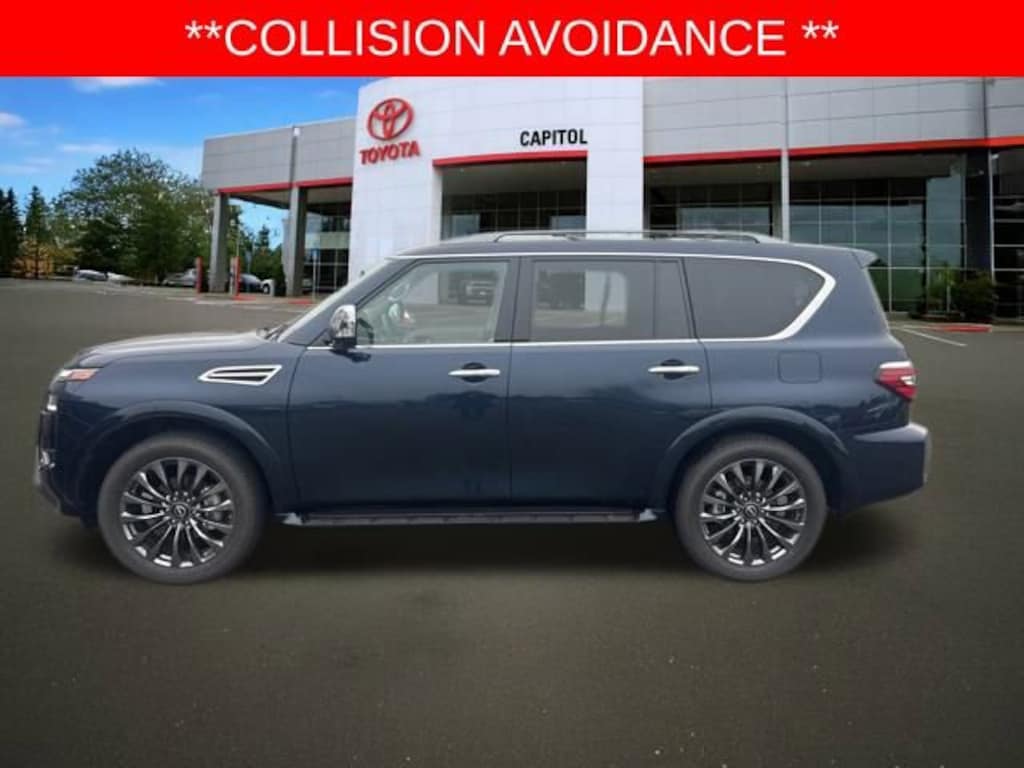 We Buy cars- Fast, Fair and Easy This 2024 Hermosa Blue Pearl Nissan Armada Platinum 4WD is well equipped and includes these features and benefits: Captain's Chairs Package (2nd Row Captain's Chairs and 2nd Row Center Console w/Padded Armrest), Cargo Package, 13 Speakers, 2.937 Axle Ratio, 3rd Row Carpeted Floor Mats - Captain Seat, 3rd row seats: split-bench, 4-Wheel Disc Brakes, ABS brakes, Air Conditioning, Alloy wheels, AM/FM radio: SiriusXM, Anti-whiplash front head restraints, Auto High-beam Headlights, Auto tilt-away steering wheel, Auto-dimming door mirrors, Auto-dimming Rear-View mirror, Auto-leveling suspension, Automatic temperature control, Brake assist, Bumpers: body-color, Climate-Controlled Front Bucket Seats, Dash Cam - Dual Camera Drive Recorder, Delay-off headlights, Driver door bin, Driver vanity mirror, Dual front impact airbags, Dual front side impact airbags, Electronic Stability Control, Emergency communication system: NissanConnect Services, Exterior Parking Camera Rear, Four wheel independent suspension, Front anti-roll bar, Front Bucket Seats, Front Center Armrest, Front dual zone A/C, Front fog lights, Front reading lights, Fully automatic headlights, Garage door transmitter: HomeLink, Heated door mirrors, Heated front seats, Heated rear seats, Heated steering wheel, HVAC memory, Illuminated entry, Illuminated Kick Plates, Illuminated Scuff Plate, Knee airbag, Leather Shift Knob, Leather steering wheel, Low tire pressure warning, Memory seat, Navigation System, Nissan USB Charging Cable Set, Occupant sensing airbag, Outside temperature display, Overhead airbag, Overhead console, Panic alarm, Passenger door bin, Passenger vanity mirror, Power door mirrors, Power driver seat, Power Liftgate, Power moonroof, Power passenger seat, Power steering, Power windows, Quilted Leather Seat Trim, Radio: NissanConnect w/SiriusXM, Rain sensing wipers, Rear air conditioning, Rear anti-roll bar, Rear reading lights, Rear seat center armrest, Rear window defroster, Rear window wiper, Reclining 3rd row seat, Remote keyless entry, Roof Rail Cross Bars - Gun Metal, Security system, Speed control, Speed-sensing steering, Speed-Sensitive Wipers, Split folding rear seat, Spoiler, Steering wheel memory, Steering wheel mounted audio controls, Tachometer, Telescoping steering wheel, Tilt steering wheel, Traction control, Trip computer, Turn signal indicator mirrors, Variably intermittent wipers, Ventilated front seats, Voltmeter, Welcome Lighting, and Wheels: 22 x 8J Machine-Faced w/Tinted Clear Coat.
