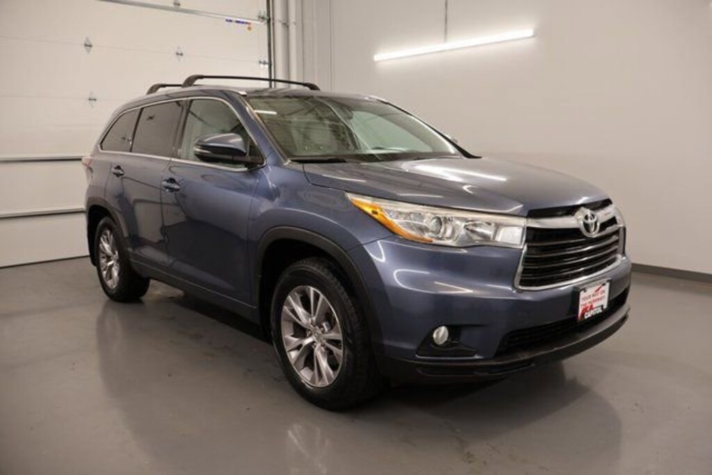 We Buy cars- Fast, Fair and Easy This 2015 Blue Toyota Highlander XLE V6 AWD is well equipped and includes these features and benefits: Exterior Parking Camera Rear, Heated front seats, Power moonroof, 3rd row seats: split-bench, 4-Wheel Disc Brakes, 4.154 Axle Ratio, 6 Speakers, ABS brakes, Air Conditioning, Alloy wheels, AM/FM radio: SiriusXM, Anti-whiplash front head restraints, Auto-dimming Rear-View mirror, Automatic temperature control, Brake assist, Bumpers: body-color, CD player, Delay-off headlights, Driver door bin, Driver vanity mirror, Dual front impact airbags, Dual front side impact airbags, Electronic Stability Control, Four wheel independent suspension, Front anti-roll bar, Front Bucket Seats, Front Center Armrest, Front dual zone A/C, Front fog lights, Front reading lights, Fully automatic headlights, Garage door transmitter, Heated door mirrors, Illuminated entry, Knee airbag, Leather Seat Material, Leather Shift Knob, Low tire pressure warning, Navigation System, Occupant sensing airbag, Outside temperature display, Overhead airbag, Overhead console, Panic alarm, Passenger door bin, Passenger vanity mirror, Power door mirrors, Power driver seat, Power Liftgate, Power steering, Power windows, Radio: Entune Premium Audio w/Nav & App Suite, Rear air conditioning, Rear anti-roll bar, Rear reading lights, Rear window defroster, Rear window wiper, Reclining 3rd row seat, Remote keyless entry, Roof rack: rails only, Security system, Speed control, Speed-sensing steering, Split folding rear seat, Spoiler, Steering wheel mounted audio controls, Tachometer, Telescoping steering wheel, Tilt steering wheel, Traction control, Trip computer, Turn signal indicator mirrors, Variably intermittent wipers, and Wheels: 18 Split 5-Spoke Machined-Face Alloy.