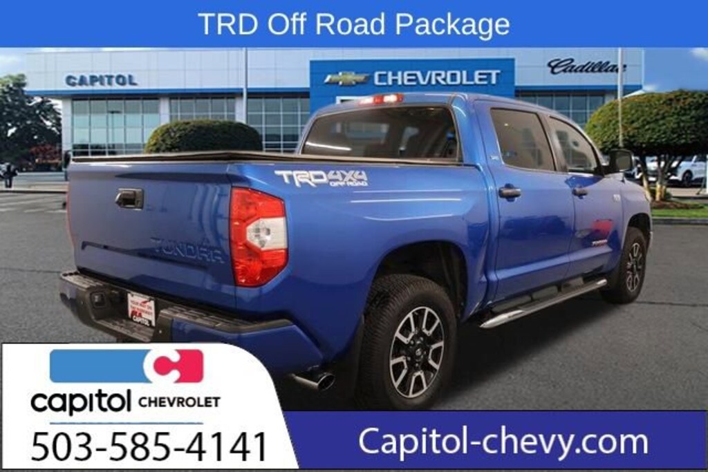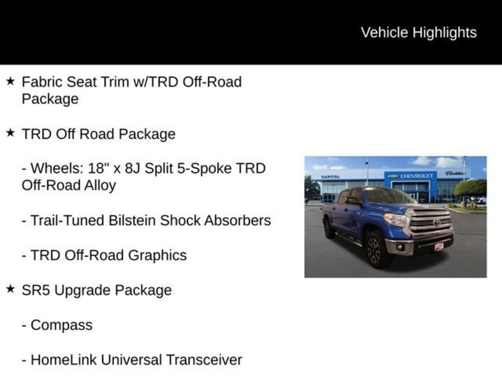 We Buy cars- Fast, Fair and Easy This 2017 Blazing Blue Pearl Toyota Tundra SR5 4WD is well equipped and includes these features and benefits: Fabric Seat Trim w/TRD Off-Road Package, SR5 Safety & Convenience Package (Blind Spot Monitor w/Rear Cross Traffic Alert, Color-Keyed Rear Bumper, and Front & Rear Parking Assist Sonar), SR5 Upgrade Package (38 Gallon Fuel Tank Capacity, Anti-Theft Immobilizer w/Alarm, Auto-Dimming Rear-View Mirror, Compass, Front Bucket Seats, HomeLink Universal Transceiver, and Urethane Tilt/Telescopic Steering Wheel), TRD Off Road Package (Trail-Tuned Bilstein Shock Absorbers, TRD Off-Road Graphics, and Wheels: 18 x 8J Split 5-Spoke TRD Off-Road Alloy), 18 x 8J Styled Steel Wheels, 3-Passenger Front Bench Seat, 4-Wheel Disc Brakes, 4.30 Axle Ratio, 6 Speakers, ABS brakes, Air Conditioning, AM/FM radio: SiriusXM, Brake assist, CD player, Deck Rail System, Driver door bin, Driver vanity mirror, Dual front impact airbags, Dual front side impact airbags, Electronic Stability Control, Exterior Parking Camera Rear, Fabric Seat Trim, Front anti-roll bar, Front Center Armrest w/Storage, Front fog lights, Front reading lights, Front wheel independent suspension, Heated door mirrors, Illuminated entry, Knee airbag, Low tire pressure warning, Occupant sensing airbag, Outside temperature display, Overhead airbag, Overhead console, Panic alarm, Passenger door bin, Passenger vanity mirror, Power door mirrors, Power steering, Power windows, Radio: Entune AM/FM/HD w/CD Player, Radio: Entune Audio Display AM/FM/HD w/CD Player, Rear reading lights, Rear seat center armrest, Rear step bumper, Rear window defroster, Remote keyless entry, Speed control, Speed-sensing steering, Split folding rear seat, Steering wheel mounted audio controls, Tachometer, Tilt steering wheel, Traction control, Trip computer, Variably intermittent wipers, and Voltmeter.