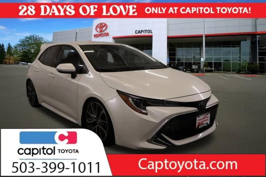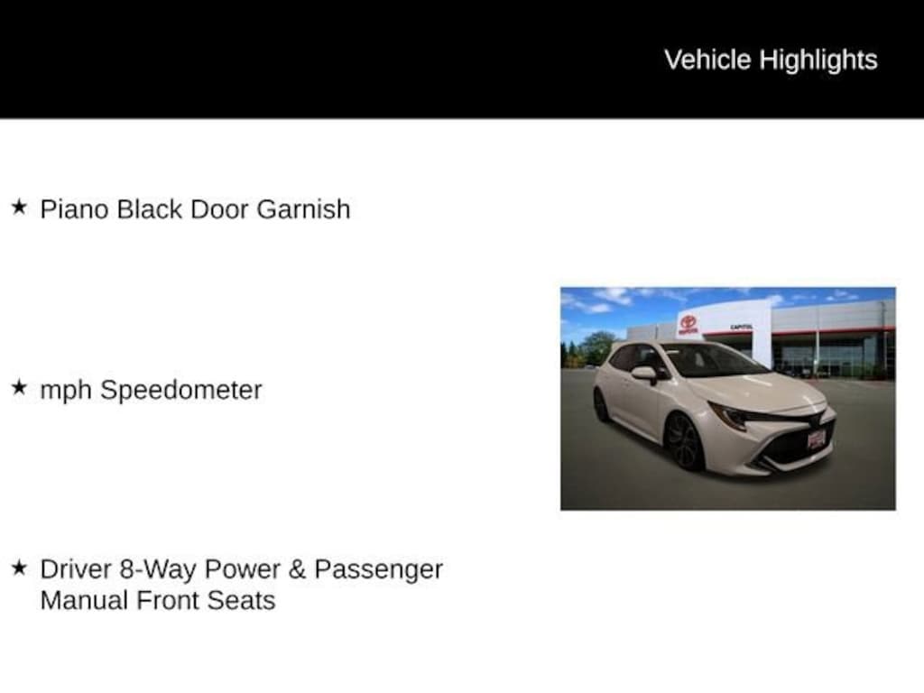 Recent Arrival! We Buy cars- Fast, Fair and Easy This 2019 Blizzard Pearl Toyota Corolla Hatchback XSE FWD is well equipped and includes these features and benefits: XSE Package (Blind Spot Monitoring, Driver 8-Way Power & Passenger Manual Front Seats, Dual Mode Air Conditioner, Fog Lamps, mph Speedometer, and Piano Black Door Garnish), 4-Wheel Disc Brakes, 6 Speakers, ABS brakes, Air Conditioning, Alloy wheels, AM/FM radio: SiriusXM, Auto High-beam Headlights, Automatic temperature control, Brake assist, Bumpers: body-color, Combination Fabric & Leather Upholstery, Compass, Delay-off headlights, Driver door bin, Driver vanity mirror, Dual front impact airbags, Dual front side impact airbags, Electronic Stability Control, Emergency communication system: Safety Connect, Exterior Parking Camera Rear, Four wheel independent suspension, Front anti-roll bar, Front Bucket Seats, Front Center Armrest, Front dual zone A/C, Front fog lights, Front reading lights, Heated door mirrors, Heated front seats, Heated Sport Front Seats, Illuminated entry, Knee airbag, Leather Shift Knob, Low tire pressure warning, Occupant sensing airbag, Outside temperature display, Overhead airbag, Overhead console, Panic alarm, Passenger door bin, Passenger vanity mirror, Power door mirrors, Power driver seat, Power steering, Power windows, Radio data system, Radio: Entune 3.0 Audio w/Upgraded Head Unit, Rear anti-roll bar, Rear seat center armrest, Rear window defroster, Rear window wiper, Remote keyless entry, Satellite Radio, Security system, Speed control, Speed-sensing steering, Split folding rear seat, Spoiler, Steering wheel mounted audio controls, Tachometer, Telescoping steering wheel, Tilt steering wheel, Traction control, Trip computer, Turn signal indicator mirrors, Variably intermittent wipers, and Wheels: 18 Bright Machined Finish Aluminum.