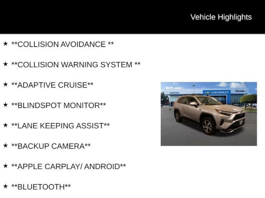 We Buy cars- Fast, Fair and Easy This 2022 Silver Sky Metallic Toyota RAV4 Prime SE AWD is well equipped and includes these features and benefits: Weather & Moonroof Package (3-Spoke Heated Leather Steering Wheel, Heated Rear Outboard Seats, Rain Sensing Wipers w/De-Icer Function, and Tilt & Slide Moonroof), 18 Alloy Wheels, 4-Wheel Disc Brakes, 6 Speakers, ABS brakes, Air Conditioning, Alloy wheels, AM/FM radio: SiriusXM, Apple CarPlay/Android Auto, Auto High-beam Headlights, Automatic temperature control, Axle Ratio: TBD, Brake assist, Bumpers: body-color, Delay-off headlights, Driver door bin, Driver vanity mirror, Dual front impact airbags, Dual front side impact airbags, Electronic Stability Control, Emergency communication system: Safety Connect with 1-year trial, Exterior Parking Camera Rear, Fabric Seat Trim (FA), Four wheel independent suspension, Front anti-roll bar, Front Bucket Seats, Front Center Armrest, Front dual zone A/C, Front reading lights, Fully automatic headlights, Heated door mirrors, Heated front seats, Heated Front Sport Seats, Illuminated entry, Knee airbag, Leather Shift Knob, Low tire pressure warning, Occupant sensing airbag, Outside temperature display, Overhead airbag, Overhead console, Panic alarm, Passenger door bin, Passenger vanity mirror, Power door mirrors, Power driver seat, Power Liftgate, Power steering, Power windows, Radio data system, Radio: Audio, Rear anti-roll bar, Rear seat center armrest, Rear window defroster, Rear window wiper, Remote keyless entry, Roof rack: rails only, Speed control, Speed-sensing steering, Split folding rear seat, Spoiler, Steering wheel mounted audio controls, Telescoping steering wheel, Tilt steering wheel, Traction control, Trip computer, Turn signal indicator mirrors, and Variably intermittent wipers.