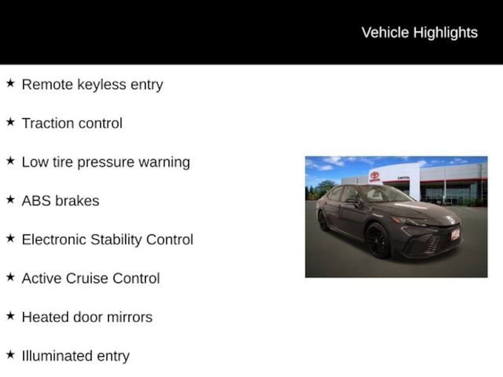 Recent Arrival! We Buy cars- Fast, Fair and Easy This 2025 Underground Toyota Camry SE FWD is well equipped and includes these features and benefits: ABS brakes, Active Cruise Control, Alloy wheels, Electronic Stability Control, Front dual zone A/C, Heated door mirrors, Illuminated entry, Low tire pressure warning, Remote keyless entry, Traction control, 4-Wheel Disc Brakes, 6 Speakers, Air Conditioning, AM/FM radio: SiriusXM, Apple CarPlay/Android Auto, Auto High-beam Headlights, Automatic temperature control, Brake assist, Bumpers: body-color, Delay-off headlights, Driver door bin, Driver vanity mirror, Dual front impact airbags, Dual front side impact airbags, Emergency communication system: Safety Connect (up to 10-year trial subscription), Exterior Parking Camera Rear, Four wheel independent suspension, Front anti-roll bar, Front Bucket Seats, Front Center Armrest, Front reading lights, Fully automatic headlights, Knee airbag, Leather Shift Knob, Leather steering wheel, Occupant sensing airbag, Outside temperature display, Overhead airbag, Overhead console, Panic alarm, Passenger door bin, Passenger vanity mirror, Power door mirrors, Power driver seat, Power steering, Power windows, Radio data system, Radio: Toyota Audio Multimedia w/8 Touchscreen, Rear anti-roll bar, Rear reading lights, Rear seat center armrest, Rear side impact airbag, Rear window defroster, Security system, SofTex & Fabric Seat Trim, Speed control, Speed-sensing steering, Split folding rear seat, Spoiler, Steering wheel mounted audio controls, Telescoping steering wheel, Tilt steering wheel, Trip computer, Turn signal indicator mirrors, Variably intermittent wipers, and Wheels: 18 Black-Finished Alloy.