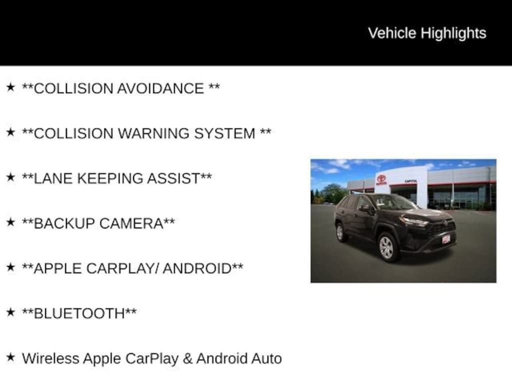 Recent Arrival! We Buy cars- Fast, Fair and Easy This 2025 Midnight Black Metallic Toyota RAV4 LE AWD is well equipped and includes these features and benefits: 17 Steel Wheels, 4-Wheel Disc Brakes, 6 Speakers, ABS brakes, Air Conditioning, AM/FM radio: SiriusXM, Auto High-beam Headlights, Brake assist, Bumpers: body-color, Driver door bin, Driver vanity mirror, Dual front impact airbags, Dual front side impact airbags, Electronic Stability Control, Emergency communication system: Safety Connect (10-year trial), Exterior Parking Camera Rear, Fabric Seat Trim, Four wheel independent suspension, Front anti-roll bar, Front Bucket Seats, Front Center Armrest, Front reading lights, Illuminated entry, Knee airbag, Low tire pressure warning, Occupant sensing airbag, Outside temperature display, Overhead airbag, Overhead console, Panic alarm, Passenger door bin, Passenger vanity mirror, Power door mirrors, Power steering, Power windows, Radio data system, Radio: AM/FM/XM Audio System, Rear anti-roll bar, Rear seat center armrest, Rear window defroster, Rear window wiper, Remote keyless entry, Speed control, Speed-sensing steering, Split folding rear seat, Spoiler, Steering wheel mounted audio controls, Tachometer, Telescoping steering wheel, Tilt steering wheel, Traction control, and Trip computer.